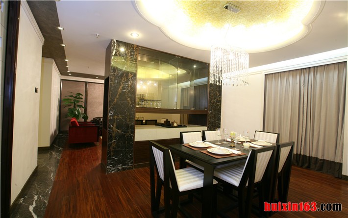 纯净精致的空间,往往都是经过设计师独具匠心的布置装饰出来的,不管是在造型的设计上、格局的布置,还是色彩的搭配都比较新颖独特,通过个性的手法,打造出一个称心如意的居室环境,在客厅的布置当中,平顶式的石膏板吊顶,背景色彩同样是以万搭的白色为主,一张亮丽的水晶吊灯,在这个纯封闭的环境当中显得比较华丽,实木铺设的地板,其色彩与整个空间的色彩有着强烈的反差,但在格局的搭配上正好将该特点运用起来,让其看似格格不入的色彩却也起到相互衬托,相互营造的效果,纯黑色的皮质沙发通过抱枕的装饰,同样也有着可圈可点的优点,而红色的沙发添加也起到一个点缀的效果。