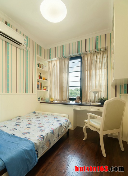 美式乡村风格的设计并非要有浓重的田园或者是大自然气息,即使局部的点缀也能生动形象的将该风格的形神特征展现出来,在本案例客厅的设计当中,整个空间大量的采用白色来铺垫,不管是在造型的设计上还是色彩的搭配上都比较轻巧,平顶式的石膏板吊顶,其色彩与墙面的色彩相同,都是以白色为主色调,别致的电视柜设计,搭配上黑色的液晶电视,鲜明的色彩反差让其显得个性又独立,实木铺设的地板,在体验感觉上也比较舒适,落地窗的设计让空间的采光更加的明亮透彻,其旁一颗绿植的添加,更是诠释了美式乡村的神韵特征,工艺精湛的窗帘也是空间的一大设计看点。