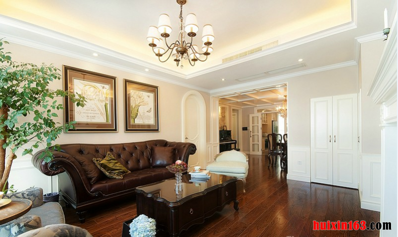 美式乡村风格的设计并非要有浓重的田园或者是大自然气息,即使局部的点缀也能生动形象的将该风格的形神特征展现出来,在本案例客厅的设计当中,整个空间大量的采用白色来铺垫,不管是在造型的设计上还是色彩的搭配上都比较轻巧,平顶式的石膏板吊顶,其色彩与墙面的色彩相同,都是以白色为主色调,别致的电视柜设计,搭配上黑色的液晶电视,鲜明的色彩反差让其显得个性又独立,实木铺设的地板,在体验感觉上也比较舒适,落地窗的设计让空间的采光更加的明亮透彻,其旁一颗绿植的添加,更是诠释了美式乡村的神韵特征,工艺精湛的窗帘也是空间的一大设计看点。