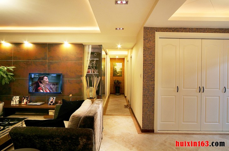 本案例是一个现代简约的装修风格设计,不管是造型的设计还是色彩的搭配都比较形象突出,整个空间的面积并不是很大,但通过设计师独具匠心的设计,却将居室空间装饰得比较充实紧凑,在客厅的布置当中,通过吊顶夹层内黄色光晕的衬托,营造出一种浪漫温馨的氛围,平顶式的石膏板吊顶,搭配上一盏别致的水晶吊灯,同样将客厅演绎得完美无缺,推拉门的设计连接的是室外阳台,同时也能作为一个窗户使用,搭配上轻质的窗帘,在装饰空间的同时也能很好的调节空间的采光效果,窗户旁一颗绿植的添加,通过跳跃性的绿植来点缀,让空间显得更加的活泼、朝气。