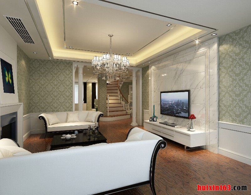 本案例是一个欧式新古典的装饰风格,在该案例的设计当中,多采用一些古典应有的装饰元素和材料,比如说罗马柱、大理石以及护墙等等,从各方面完美的展现出贵族应有的气质,整体效果既有着现代的时尚感,也将稳重大方的一面展现得淋漓尽致,这是一套别墅的装修,各功能房间都有着自己的独有气质,比如说客厅的装饰,多以白色为整个空间的主题,在视觉效果上呈现出一种干净整洁的感觉,平顶式的石膏板吊顶,通过线条的装饰,让吊顶展现出一种立体的感觉,一盏华丽的水晶吊灯,更是演绎出一种华丽的低调美感,实木铺设的地板同样有着比较良好的触感,如果在适当的添置一些绿植,其装饰效果会更加的完美。
