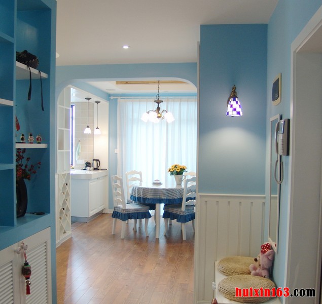 在本案例的设计当中,虽说是采用地中海风格的装修风格,但在空间色彩的搭配上还是融入了一些田园风格的色彩元素,从而将空间装饰出一种别样的风味,例如客厅的装饰布置,作为一个接客、待客的地方,其空间布置的美观度一定要满足业主自己的审美观点,吊顶的色彩以白色为主,实木横梁的装饰,搭配上一盏亮丽的吊灯,个性的灯罩无疑凝聚着整个空间的视觉焦点,而浅蓝色的墙纸铺贴,在炎热的酷夏还能营造出一种清凉的感觉,整个空间所占据的面积并不是很大,但通过设计师独具匠心的设计与布置,却将居室打造得比较充实而紧凑,一张小巧而个性的茶几,摆放一束向日葵正好起到一个画龙点睛之笔。