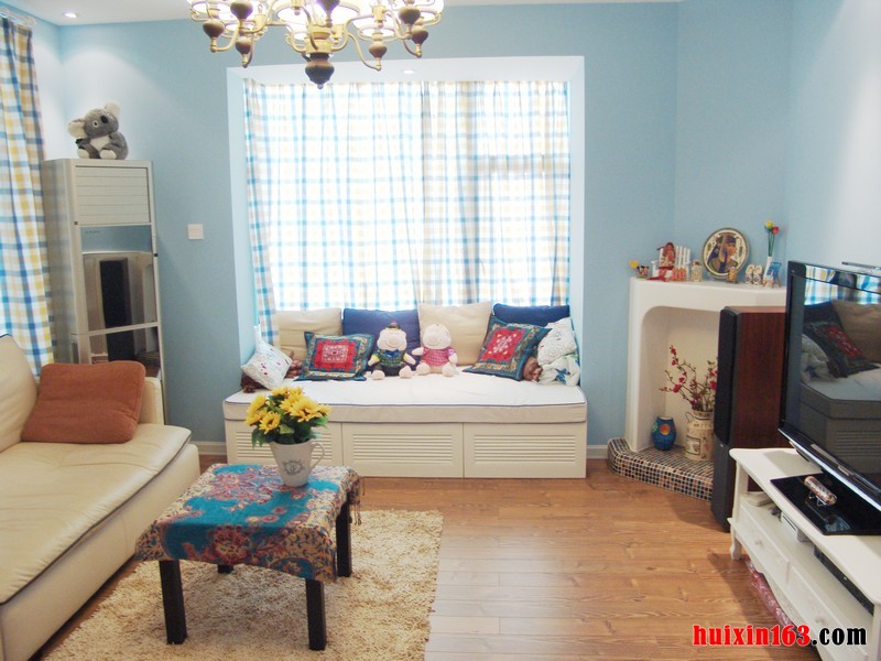 在本案例的设计当中,虽说是采用地中海风格的装修风格,但在空间色彩的搭配上还是融入了一些田园风格的色彩元素,从而将空间装饰出一种别样的风味,例如客厅的装饰布置,作为一个接客、待客的地方,其空间布置的美观度一定要满足业主自己的审美观点,吊顶的色彩以白色为主,实木横梁的装饰,搭配上一盏亮丽的吊灯,个性的灯罩无疑凝聚着整个空间的视觉焦点,而浅蓝色的墙纸铺贴,在炎热的酷夏还能营造出一种清凉的感觉,整个空间所占据的面积并不是很大,但通过设计师独具匠心的设计与布置,却将居室打造得比较充实而紧凑,一张小巧而个性的茶几,摆放一束向日葵正好起到一个画龙点睛之笔。