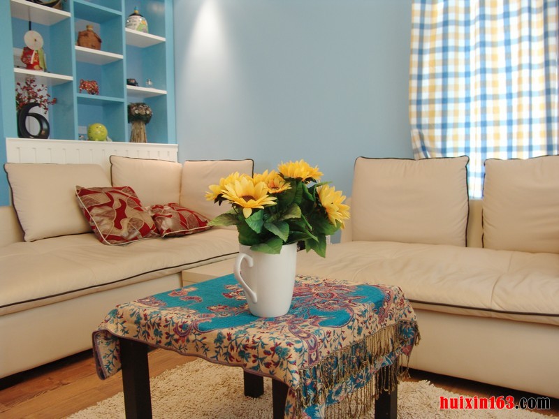 在本案例的设计当中,虽说是采用地中海风格的装修风格,但在空间色彩的搭配上还是融入了一些田园风格的色彩元素,从而将空间装饰出一种别样的风味,例如客厅的装饰布置,作为一个接客、待客的地方,其空间布置的美观度一定要满足业主自己的审美观点,吊顶的色彩以白色为主,实木横梁的装饰,搭配上一盏亮丽的吊灯,个性的灯罩无疑凝聚着整个空间的视觉焦点,而浅蓝色的墙纸铺贴,在炎热的酷夏还能营造出一种清凉的感觉,整个空间所占据的面积并不是很大,但通过设计师独具匠心的设计与布置,却将居室打造得比较充实而紧凑,一张小巧而个性的茶几,摆放一束向日葵正好起到一个画龙点睛之笔。