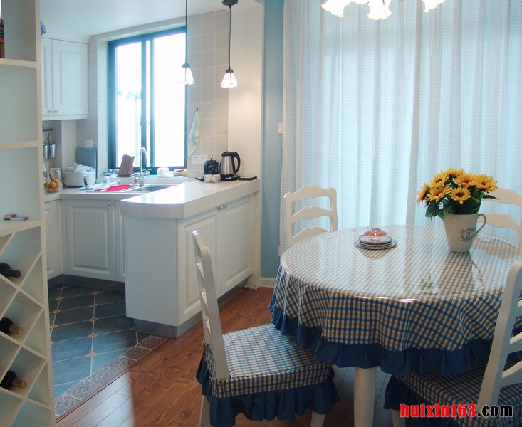 在本案例的设计当中,虽说是采用地中海风格的装修风格,但在空间色彩的搭配上还是融入了一些田园风格的色彩元素,从而将空间装饰出一种别样的风味,例如客厅的装饰布置,作为一个接客、待客的地方,其空间布置的美观度一定要满足业主自己的审美观点,吊顶的色彩以白色为主,实木横梁的装饰,搭配上一盏亮丽的吊灯,个性的灯罩无疑凝聚着整个空间的视觉焦点,而浅蓝色的墙纸铺贴,在炎热的酷夏还能营造出一种清凉的感觉,整个空间所占据的面积并不是很大,但通过设计师独具匠心的设计与布置,却将居室打造得比较充实而紧凑,一张小巧而个性的茶几,摆放一束向日葵正好起到一个画龙点睛之笔。