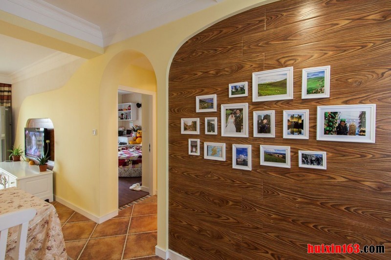 本案例的田园风所展现的是一种浪漫、温馨的一面,通过色彩的搭配以及造型的设计,完美的诠释了该风格的形神特点,客厅的吊顶还是如出一辙的平顶式石膏板吊顶,搭配上一盏个性的铁艺吊灯,将干净利落的一面展现得淋漓尽致,而且整个背景墙的色彩以暖色系为主,沙发背景墙局部又做了造型处理,通过实木饰面的装饰,照片墙的衬托,色彩的点缀,让空间显得更加有设计看点,推拉门的设计连接的是室外阳台,精致的窗帘同样让客厅显得比较个性时尚,而且还让空间的采光效果显得比较明亮透彻,沙发的造型也比较别致,两旁恰到好处的绿植添加,也生动形象的展现出田园风格的韵味。
