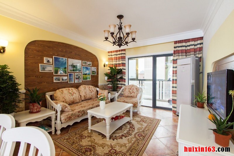 本案例的田园风所展现的是一种浪漫、温馨的一面,通过色彩的搭配以及造型的设计,完美的诠释了该风格的形神特点,客厅的吊顶还是如出一辙的平顶式石膏板吊顶,搭配上一盏个性的铁艺吊灯,将干净利落的一面展现得淋漓尽致,而且整个背景墙的色彩以暖色系为主,沙发背景墙局部又做了造型处理,通过实木饰面的装饰,照片墙的衬托,色彩的点缀,让空间显得更加有设计看点,推拉门的设计连接的是室外阳台,精致的窗帘同样让客厅显得比较个性时尚,而且还让空间的采光效果显得比较明亮透彻,沙发的造型也比较别致,两旁恰到好处的绿植添加,也生动形象的展现出田园风格的韵味。