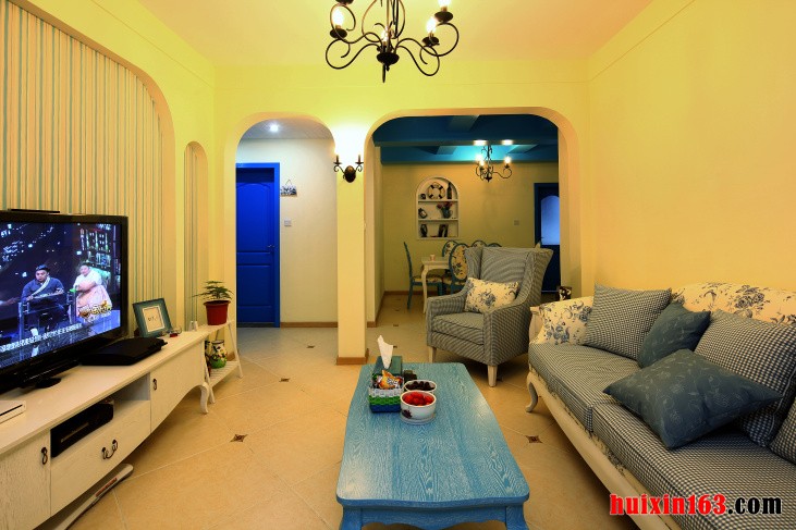 本案例的装修设计其风格为地中海风格,没有大量的元素堆砌,通过局部适当的点缀,完美的将该风格的特点演绎的淋漓尽致,在客厅的装饰布置当中,采用平顶式的石膏板吊顶,搭配上一盏工艺个性的铁艺吊灯,让居室显得更加的唯美,其背景色彩以墙面的背景色彩都以暖色系的色彩为主,将浪漫温馨的氛围展现的淋漓尽致,一张浅蓝色的实木茶几,在这个富有温馨的环境当中就显得比较独特,恰到好处的点缀更加能生动形象的将地中海风格的形神特征演绎出来,如果在电视柜上时尚的布置一些绿植,其装饰效果可能会更加完美,在沙发背景墙后增加一些照片,也能将空间的美提升一个档次。